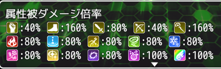 虹属性独自の耐性になっているため注意。物理属性は通常より2割固く、自然属性も音と虹以外2割固いです。