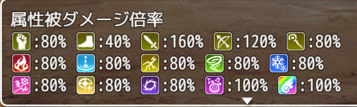 虹属性独自の耐性になっているため注意。物理属性は通常より2割固く、自然属性も音と虹以外2割固いです。