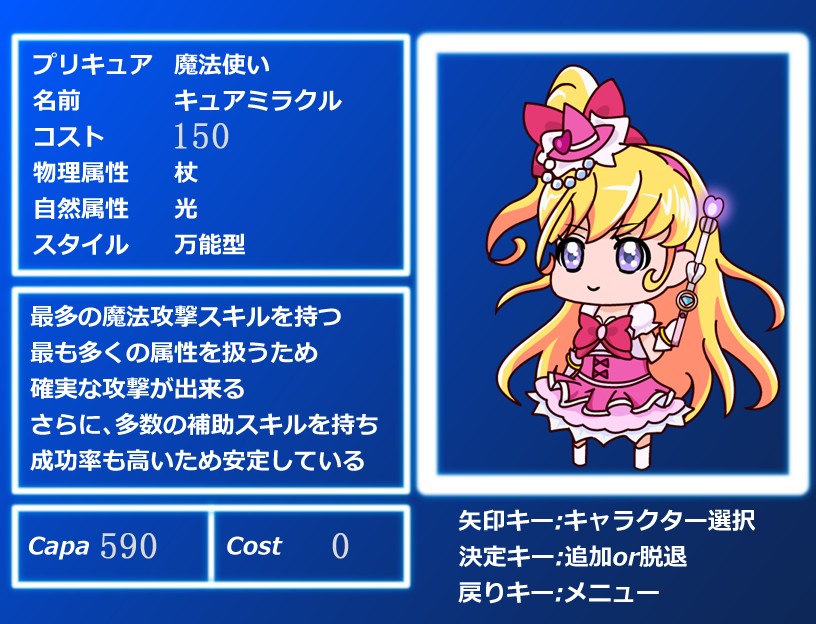 魔法の火力が非常に高くST消費も安いが、物理に関しては全く出来ないといった魔法に偏ったプリキュアである。