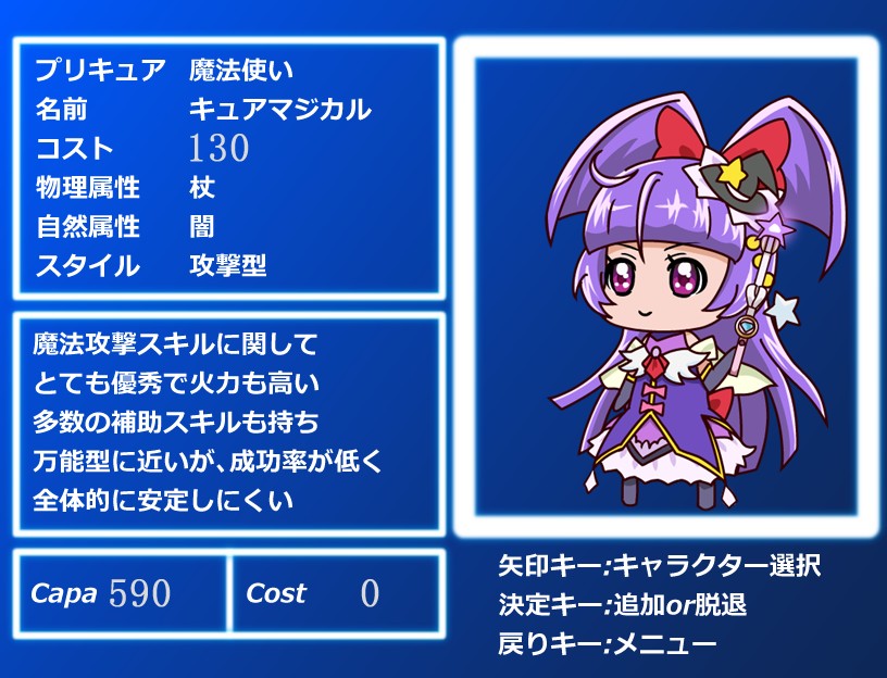 魔法使い勢の特徴として、魔法スキルはレートに対してST消費が低めという長所があるので低コストプリキュアのなかでは火力はかなり高め。
