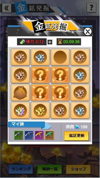 銅鉱発掘:金鉱貨幣+100、金鉱Pt+100、ランダムのアイテム報酬