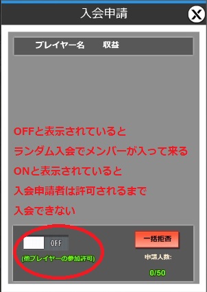 他プレイヤーの参加許可をON(表示上OFF)にすると、ランダム入会や入会申請で、許可する必要なく誰でもウェルカム状態になる。