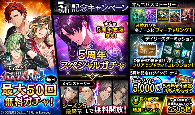 毎日のデイリー報酬では5周年の限定トーク開放アイテムや、HIGH&LOWのグレードアップアイテムが獲得できます。