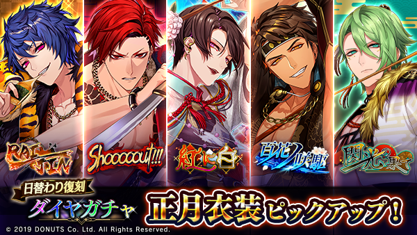 ケイ、銀星、夜光、ソテツ、ギィ、吉野が正月衣装を纏ったカードが復刻した。
