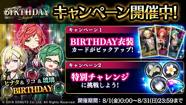8月1日(金)0:00より8月誕生日キャストを祝うBIRTHDAYキャンペーン【August】が開催される。