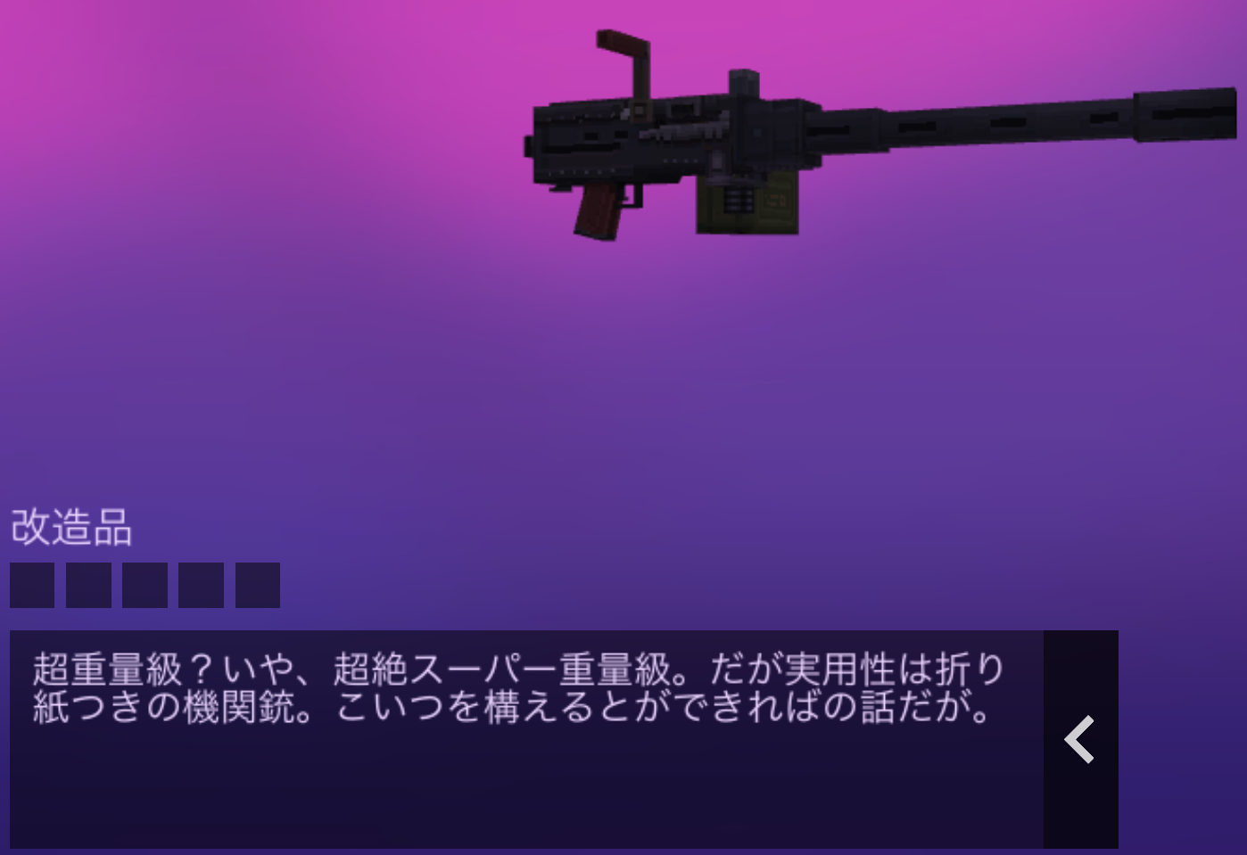 ちなみに特定の改造を装備すると機動性は全武器の中で最低値の1になる。