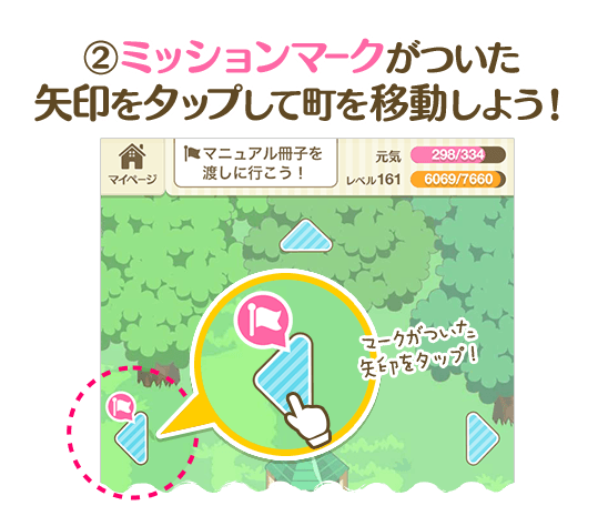 マークが付いた矢印をタップして移動。 移動するたびに元気を消費して経験値、メンがもらえるよ!