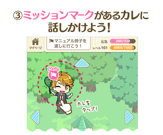 ミッションマークがあるカレは君に何かを言いたがってるぞ! カレをタップするとストーリーが進むよ!