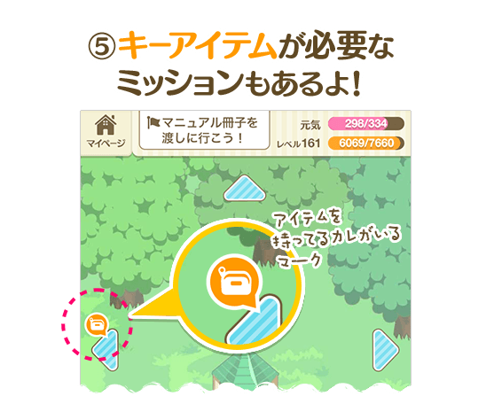 キーアイテムを探すミッションもあるよ。 矢印のキーアイテムアイコンの方角をタップしよう!
