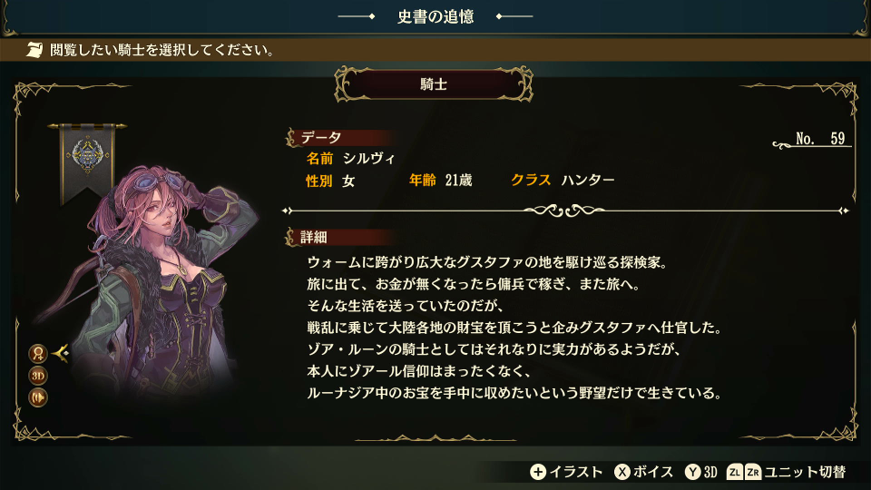ゲーム中の言動ではもっぱら遺跡あさりがライフワークであるように見受けられるのだが、