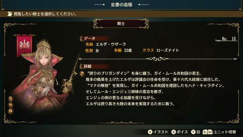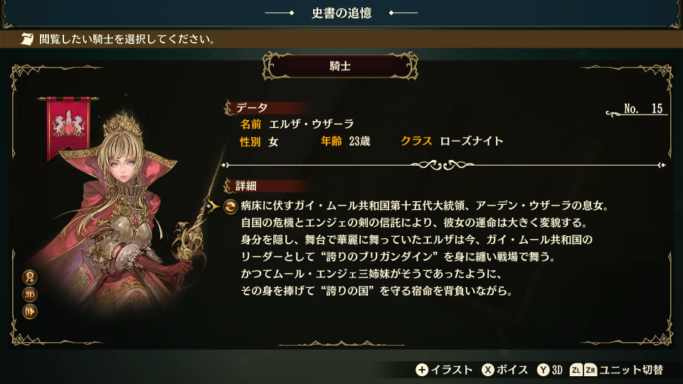バレエが趣味。立場を隠してジルという名で活躍していた。踊るルーンの騎士というと前作のコルチナを彷彿とするが、エルザは国の長として滅私奉公、重責を全うしておりだいぶ違う。恋も趣味も順風満帆なノーザリオのルビーノと比べるとえらい落差である。個人としてみればガイ・ムールが滅亡した方が幸せなのかもしれない。