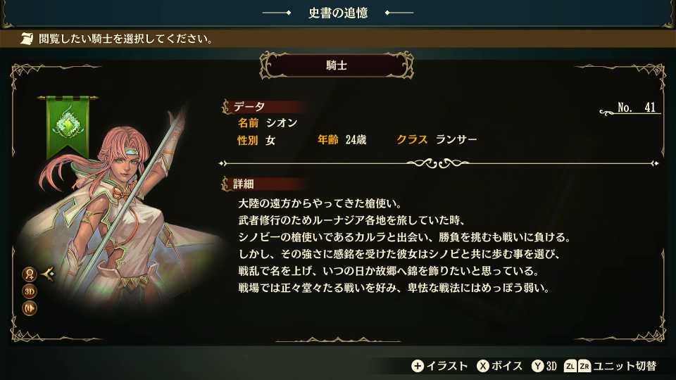 余談だが、デフォ槍騎士で初期クラスがテンプルナイトでなくランサーなのは彼女と在野騎士のシアーネの2人のみ。能力的にもどっこいどっこいである。