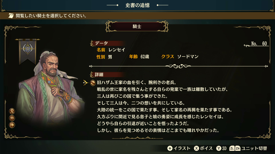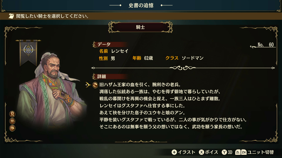 息子のユウキは37歳差、娘のアンは43歳差とえらい離れている。結婚よりも大陸統一に励むユウキに家の者は気を揉んでいるようだが、レンセイは息子にとやかく言う資格は無さそう。レンセイからすればハザム滅亡・お家衰退は祖父の頃の出来事で身近なものだろうが、息子娘は家名存続に強いこだわりは見せておらず少し温度差がある。時代の遷り変わりに立ち会っている老兵と言える。