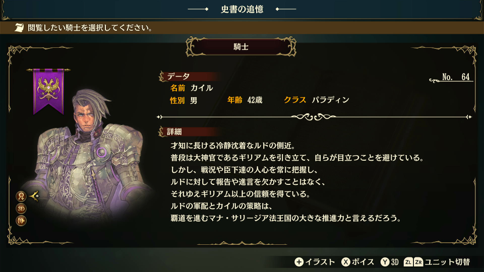 初期レベルが高いため彼自身の伸びしろは少なく、配下の騎士やモンスターの育成も視野に入れた部隊編成・運用を心掛ける必要がある。