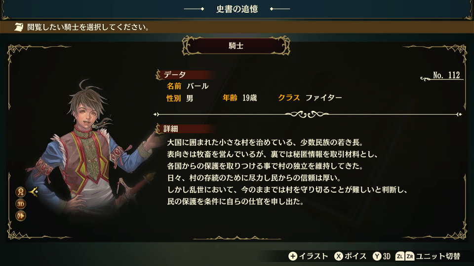ゲーム中では一介の騎士に過ぎないものの、大器としての素質を感じさせるキャラクターである。