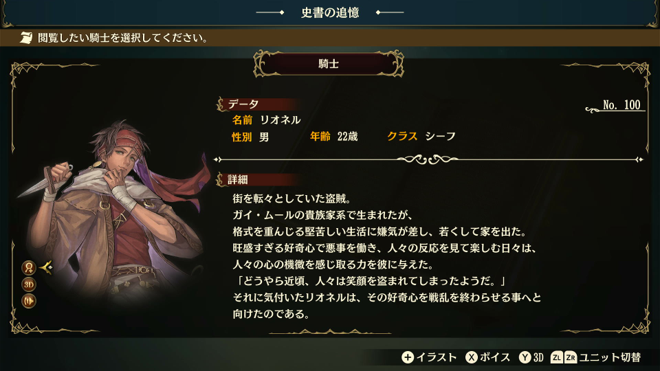 ガイ・ムールに仕官すればコソドロ生活から更生して故郷で身を立てる形になり格好がつくのだが、他国に仕官すると戦乱を終わらせるために故郷にも敵対するすごい男になる。ミレルバに仕官しようものなら盗賊から海賊である。統魔力に恵まれておりどこの国でも一軍になれるルーンの騎士だが、所属国で彼のキャラクターが随分変わって感じられる。