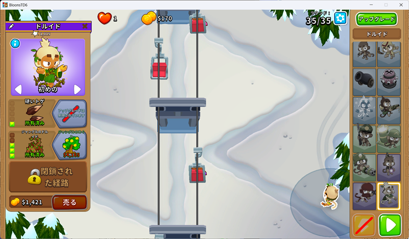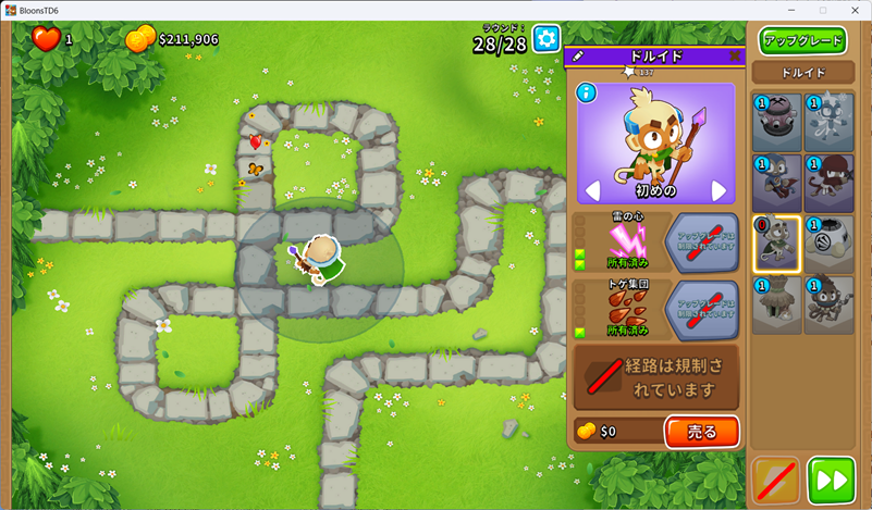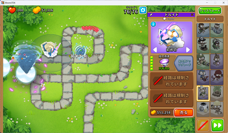 コメントではバッカニア0-4-0でBFBと中のMOABを割って、ドルイド4-0-1で遅い陶器を割るという形かと思います。