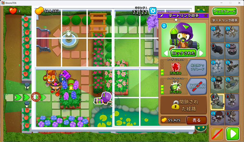 - 爆弾4-0-2x4、+α:爆弾4-0-2で一気に割っていく。最初の直線に対して垂直に並べるなどして、同時に攻撃が飛ぶようにすると良さそう。黒風船が余ることがあるので、+αで補助をする。ダーツ0-3-2やスナイパーなど。