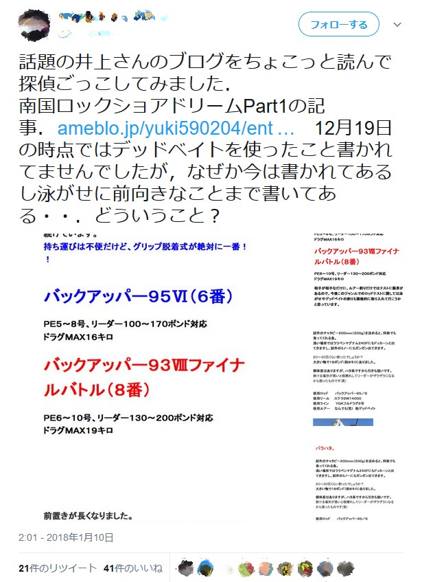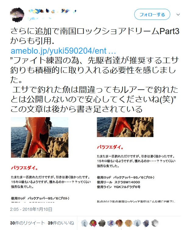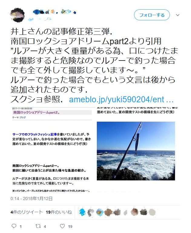 ◯同日その後、別人物により、井上氏の別ブログ記事「南国ショアロックドリームPart.1」上、
