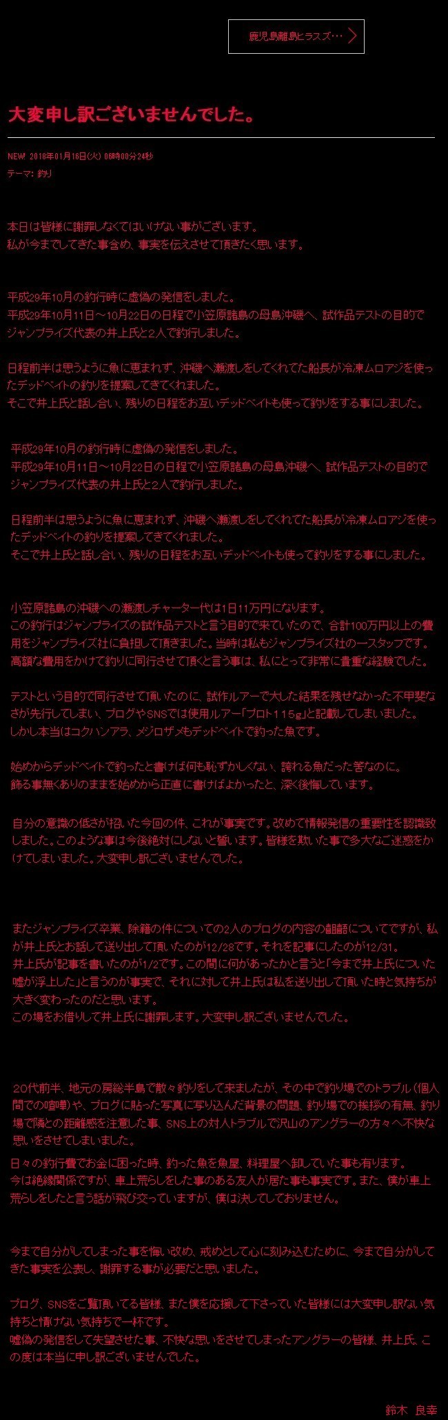 ◯2018/1/16、鈴木氏、自らのブログ上で謝罪文を記載。