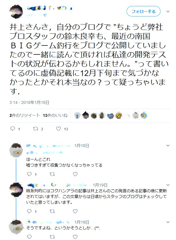 他に、コメント欄にてブログ読者とのやりとりで、代表として不正を謝罪。