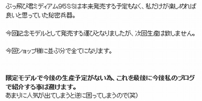 宣伝です。人気大爆発だからね。いろいろ頑張ってください。2016-2-26 ぶっ飛び君ミディアム95SS発売します!!(キャッシュ)
