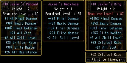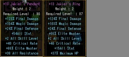 職人達の作品は+13強化品で、ペンダントが鬼化しているのが解る。リングに関してはHP補正が37%付加され、PVPを重視したマジシャンにとっては良い装備となるが、基本変身状態を考えた場合はSTA振りだけでHPはカンストするので不要になる。ネックレスに関しては現在不明(現在13を作成中)