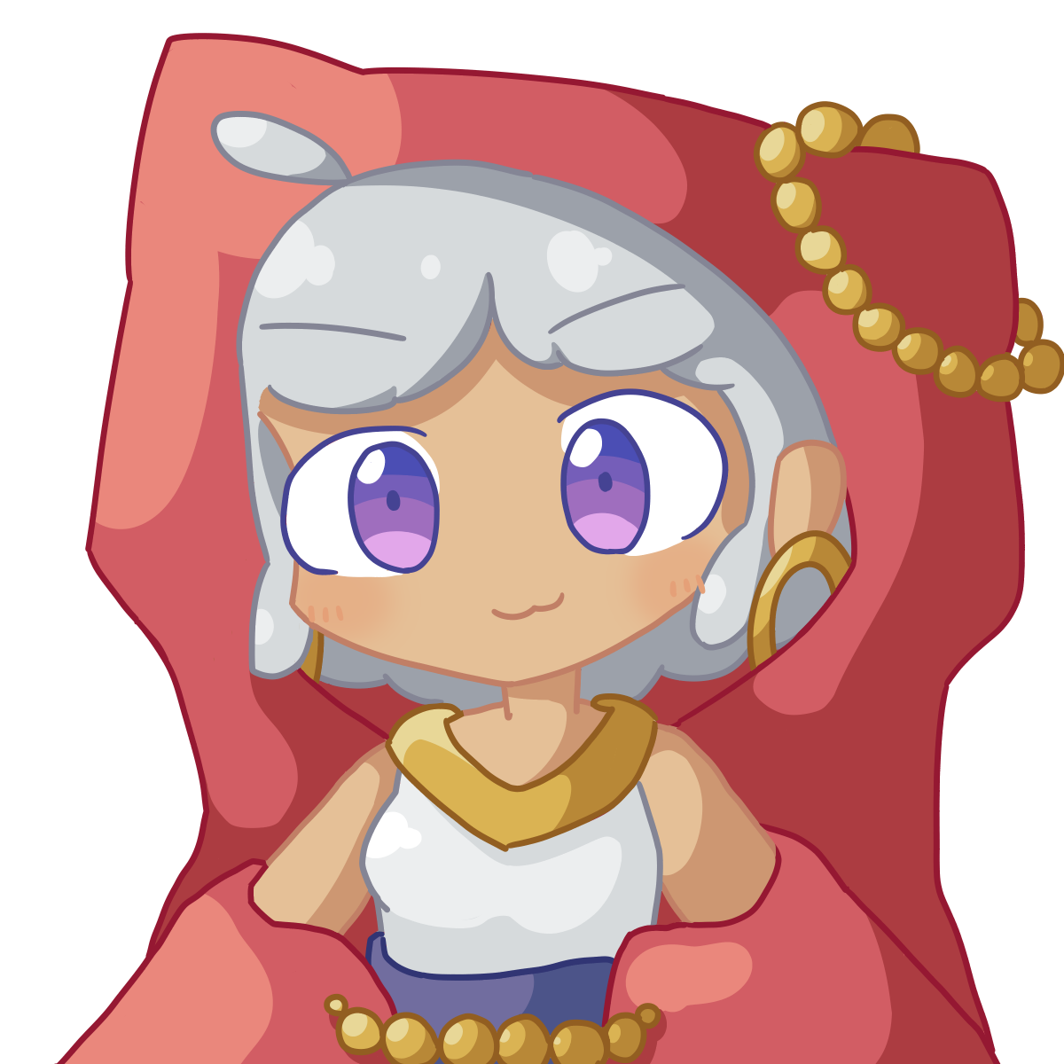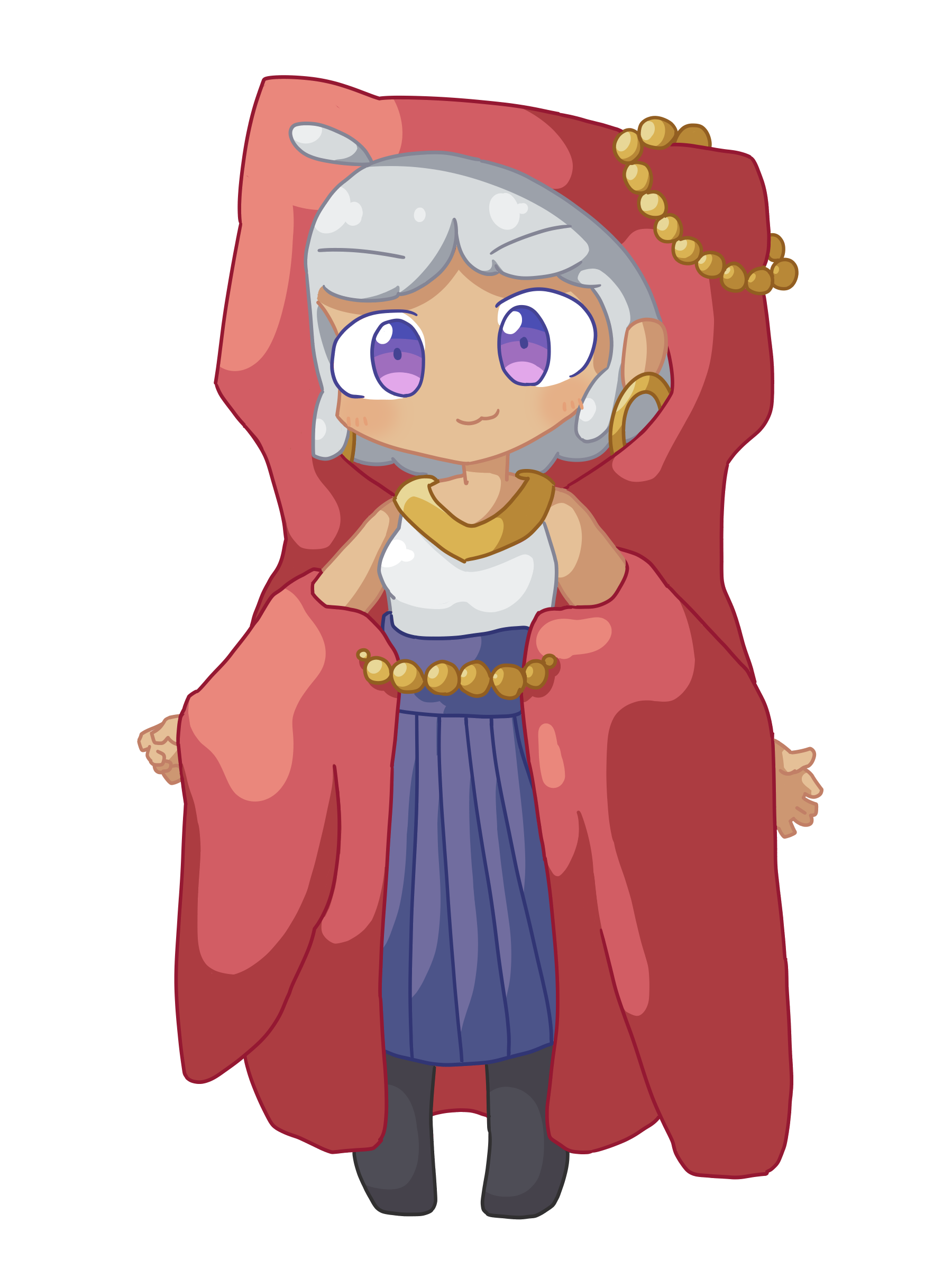 赤い外套に身を包み、頭の部分が猫耳のように盛り上がっており左の耳の部分に金色の数珠がくっついている。トップスは金色に染められたV字の襟口を持つノースリーブの白い服に、ボトムスは紫色の袴によく似たものをハイウエストで履いている。肩だしの赤い上着は腰のあたりで金色の数珠でつながっており、着崩れないようになっている。金色の大きなイヤリングを両耳につけている。