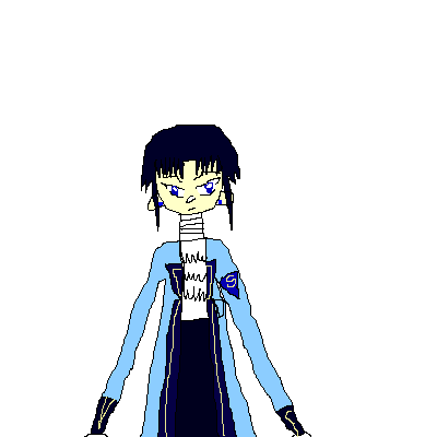 服装はフリルタイの制服をきていて、上着とズボンの色は水色っぽい青でセーターは紺色。若しくは水色いフリルタイの制服を着てい