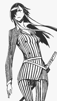 紫の長髪と切れ長のつり目が特徴的でその表情は泣く子も黙る