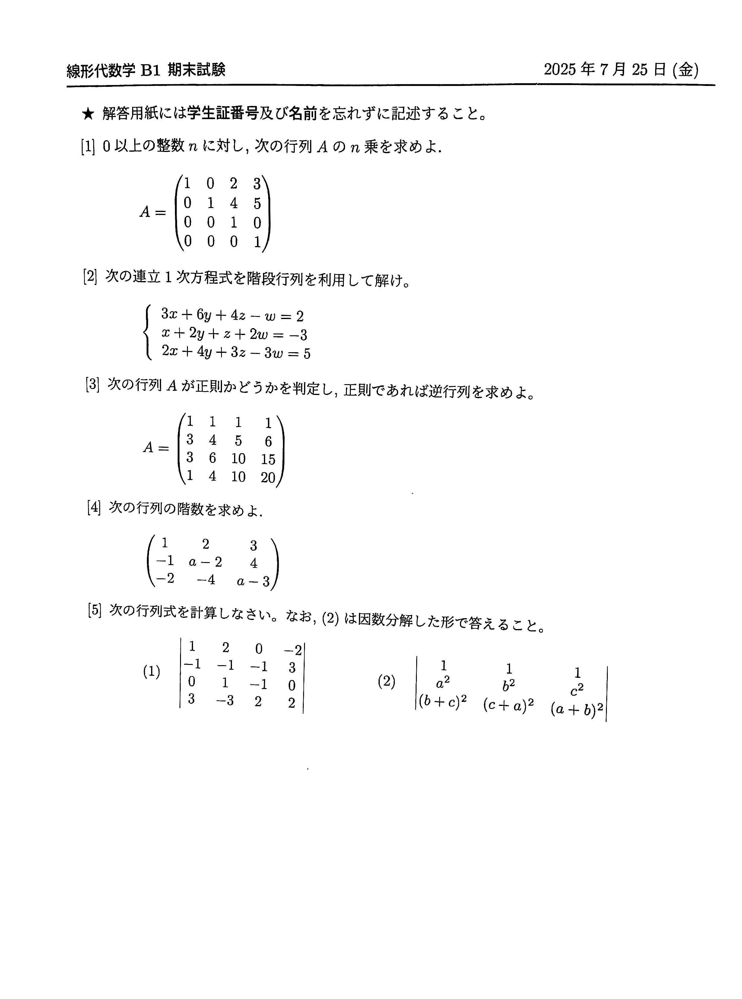 25生より>2025年から担当が福室先生から松田先生に変わった。T2の中頃にレポート課題が出される。期末テストは基本的にレポート課題から出題されるので、テスト前にレポート課題を復習しておけば誰でも満点を取れるだろう。2024年以前と出題範囲が変わり、難易度も大幅に易化したので2024年以前の過去問を確認する必要はないと思われる。