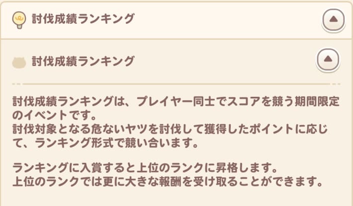 ゲーム内のヘルプにユーザー同士で競い合うランキングイベントの開催を示唆するような項目があります。討伐対象を倒して獲得したポイントを競うコンテンツはいずれ実装される可能性が高いです。