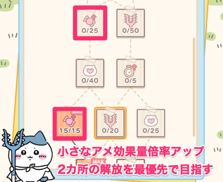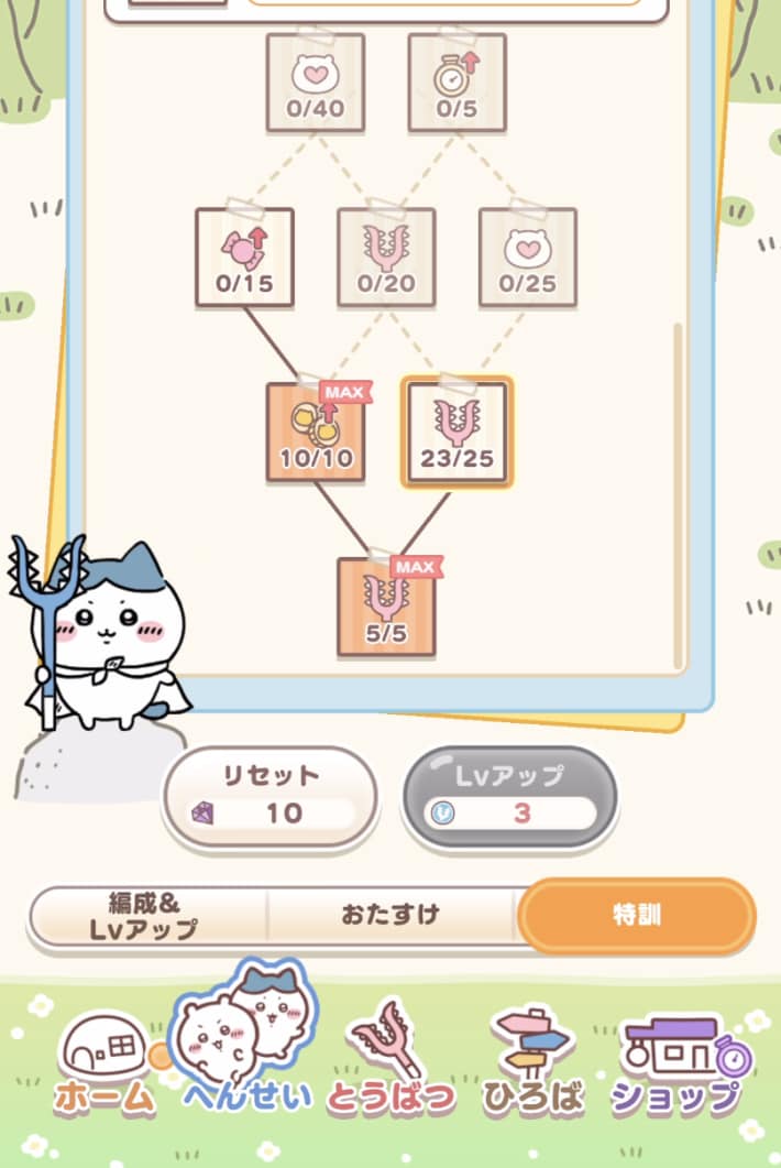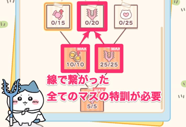 次のマスの解放には線で繋がった手前のマスの最大強化が必要になってきます。そのため、奥のマスを解放しようとすると、最終的に満遍なく特訓する必要があります。