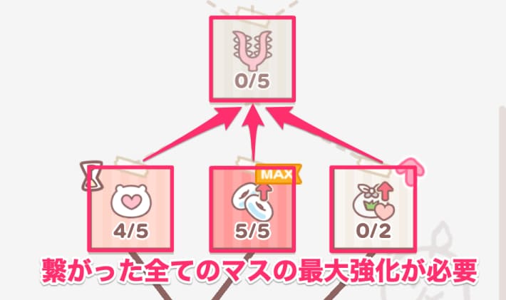 次のマスの解放には、手前にある線で繋がった全てのマスを最大まで強化する必要があります。そのため、勉強を進めるためには最終的に満遍なく強化する必要があります。