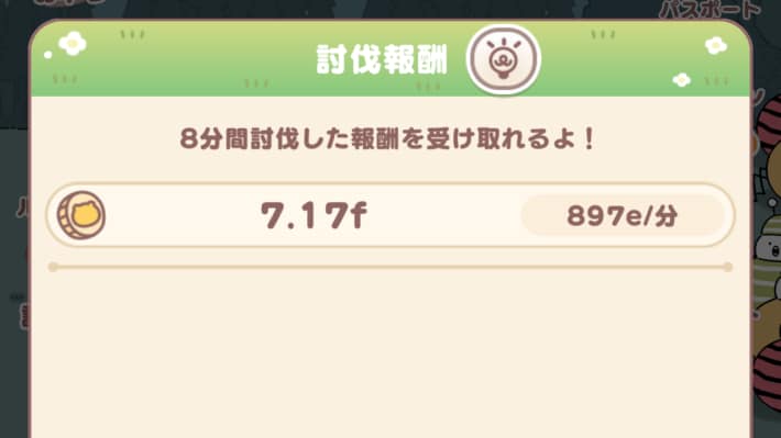 討伐報酬は、時間経過で獲得量が増加するため、アプリを起動していなくても貯まっていきます。ステージの進行度に応じて1分あたりにもらえる量が増えるので、アプリを落とす前に行けるところまで討伐を進めておくと効率的です。