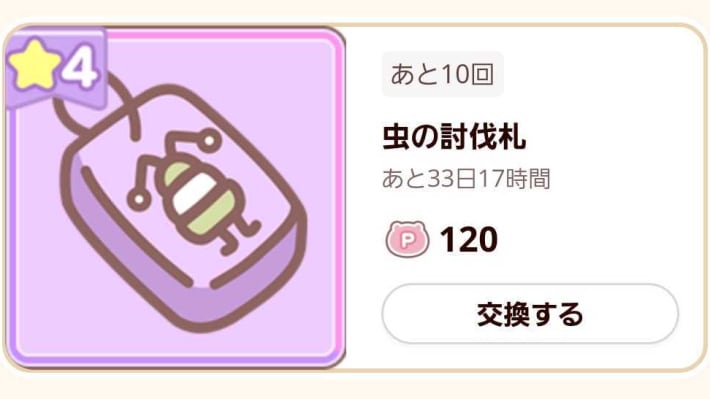 WEBストアの利用で貯まる、ちいぽけポイントとの交換でも虫の討伐札が入手できます。なお、現在交換可能な虫の討伐札は、回数と期限が決まっている点に注意です。