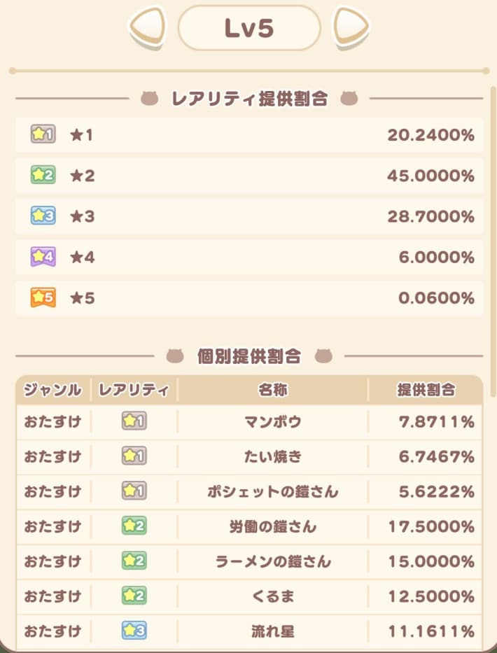 ちいぽけのガチャはゲーム開始時点では高レアリティの武器やおたすけが排出されないため、リセマラは非推奨です。ガチャを一定回数引く毎にガチャLvが上がって行き、最高レアリティが排出されるようになる仕組みとなっています。
