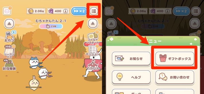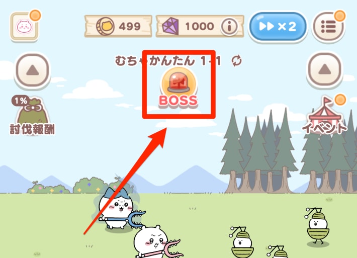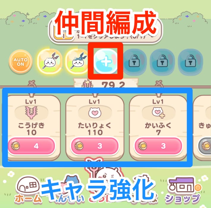 ボスに勝てない場合は画面下にあるキャラ強化でちいかわ達を強化しましょう。1-6クリアまでなら攻撃だけを強化しておけば問題ありません。また、キャラアイコン部分の+からうさぎを編成することもできます。