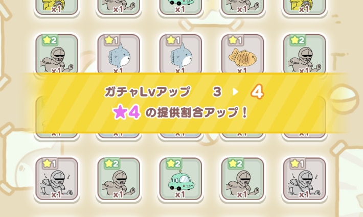 ただし、ガチャLvが上がれば上がるほど星4の排出確率も上がり、ガチャLv10では70%もの確率で星4を入手できます。ゲームを進めれば簡単に取り返せるほどの誤差でしかないので、無理に星4を狙う価値は低いです。
