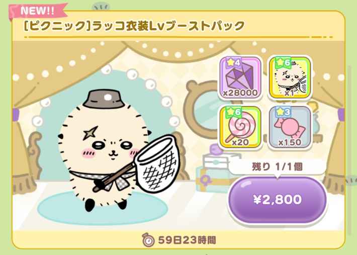 ちいぽけのラッコ(ピクニック)はショップで購入することで入手することができます。メニューの「ショップ」から「キャラ」「衣装」と進んで購入しましょう。