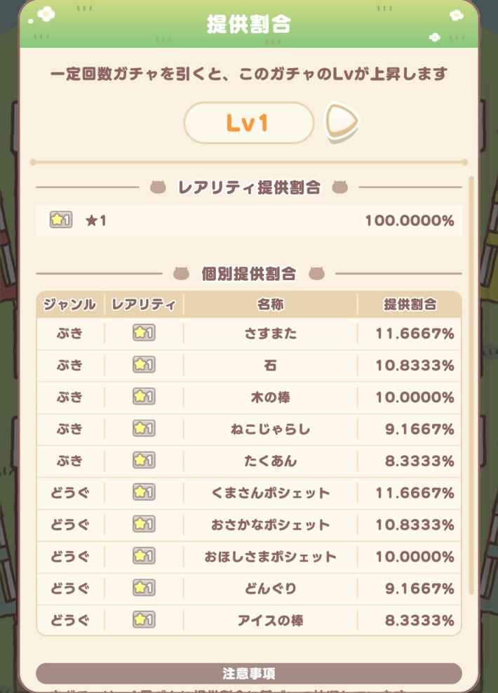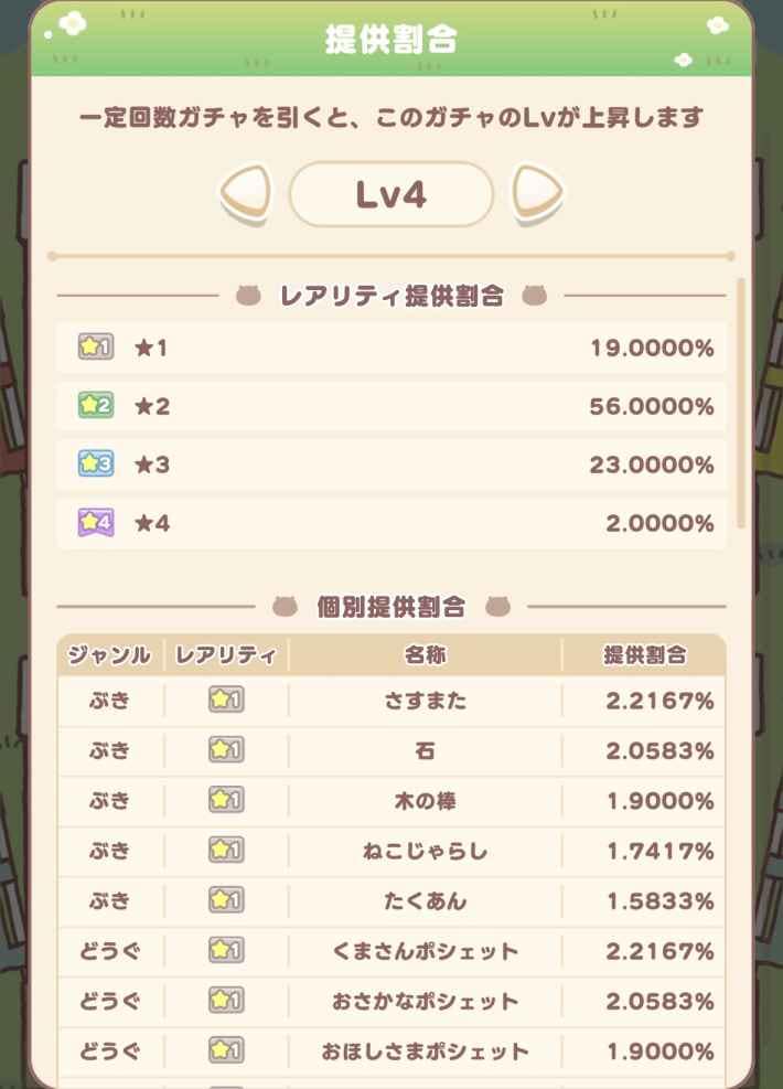 ちいぽけのガチャは、引けば引くほどガチャレベルが上がっていき、高レアが排出される確率が上がっていきます。ガチャレベルを上げるまでは低レアしか排出されないため、たくさんガチャを引いてレベルを上げることが重要です。