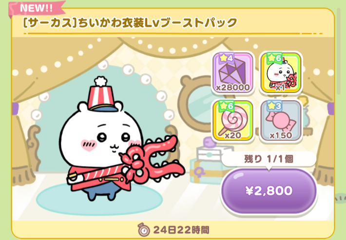 ショップに新たに追加された衣装パックでは、サーカス系のちいかわとハチワレ、くりまんじゅうの3種類が新登場。どのキャラもイベント討伐の報酬量を増やしてくれるので、戦力補強やイベントをガッツリ遊びたい人は購入を検討しましょう。