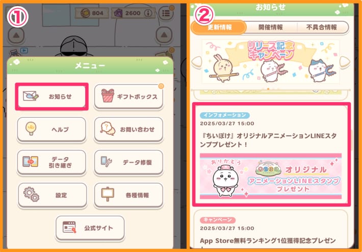 - お知らせで特典スタンプのバナーをタップ