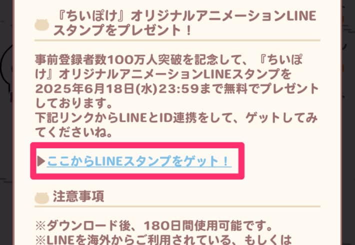 LINEスタンプは事前登録特典ですが、サービス開始前に事前登録をしていなかった方でもLINEのIDと連携すれば受け取れます。