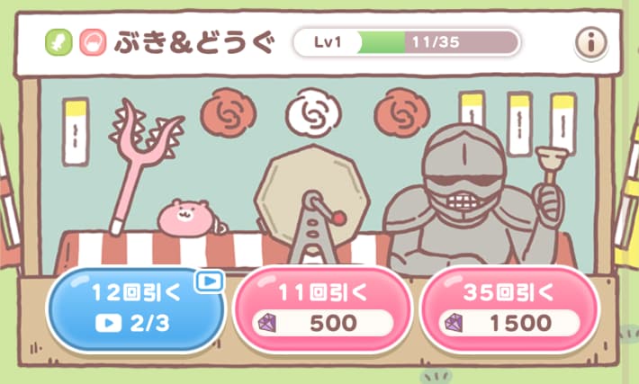 ちいぽけの武器はぶき&どうぐガチャを引くことで入手できます。広告動画を視聴することで、無料でガチャを引くことも可能です。
