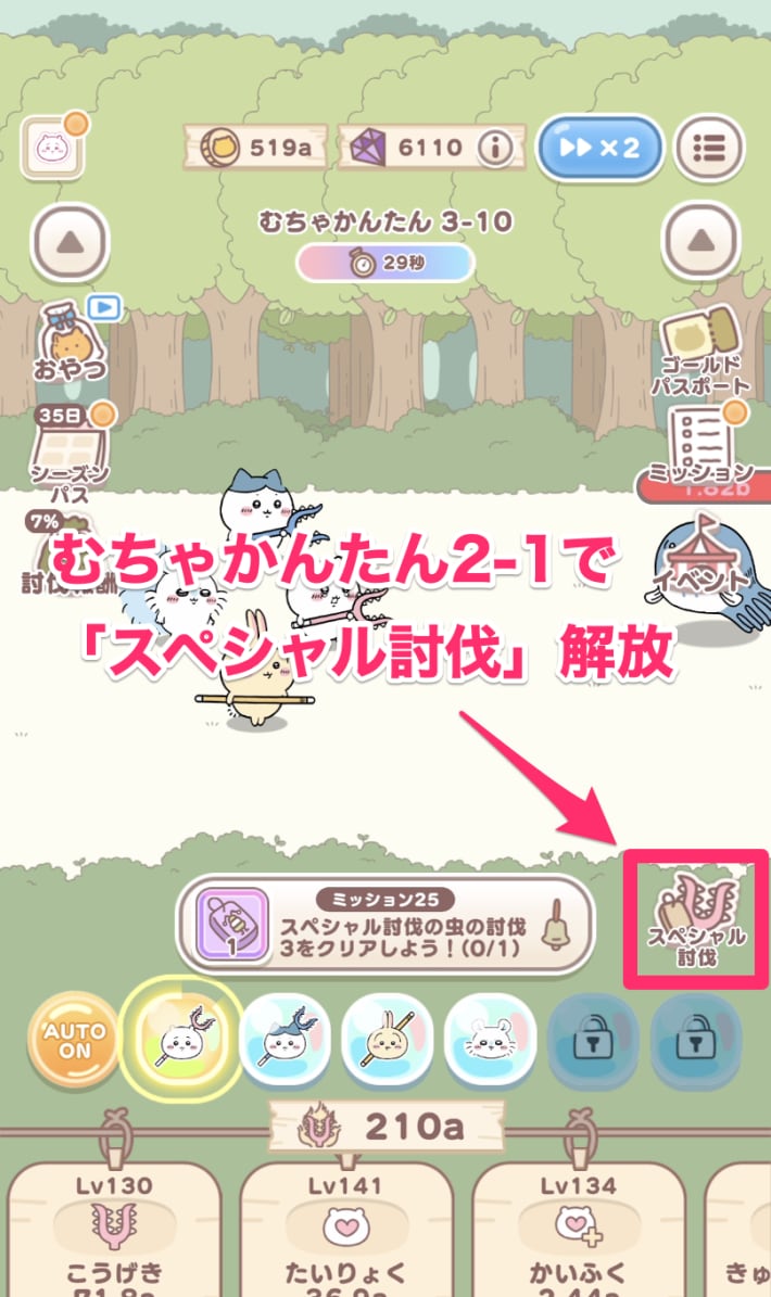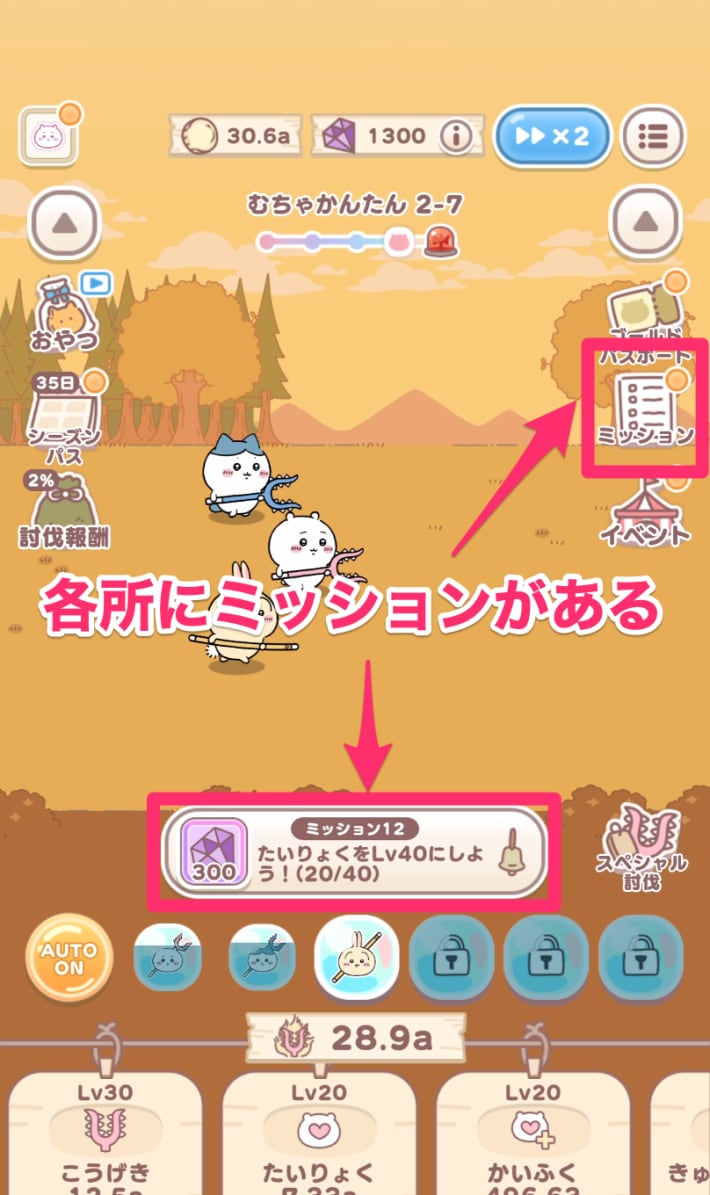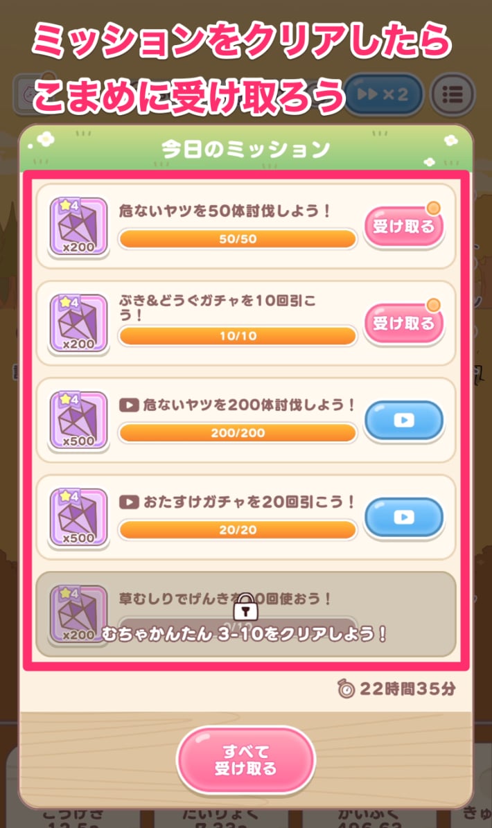 討伐やむちゃうまフェスなどに設定されているミッションをクリアすると、宝石を大量に入手することができます。中には広告を見ることでクリアできるミッションもあるので、毎日のミッション内容はチェックしておきましょう。