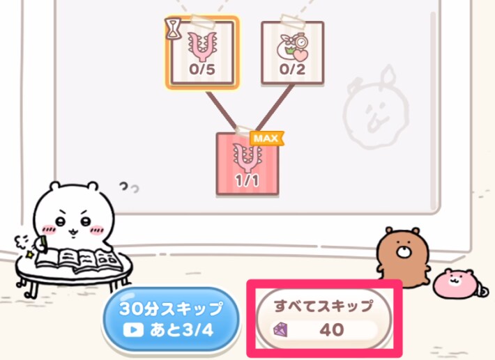 「草むしり」を20m進めると解放される「勉強」のスキップでも宝石を使用します。1分あたり10個の宝石が必要になりますが勉強するにはフエラムネも集める必要があるので、無理に宝石でスキップしなくても良いでしょう。