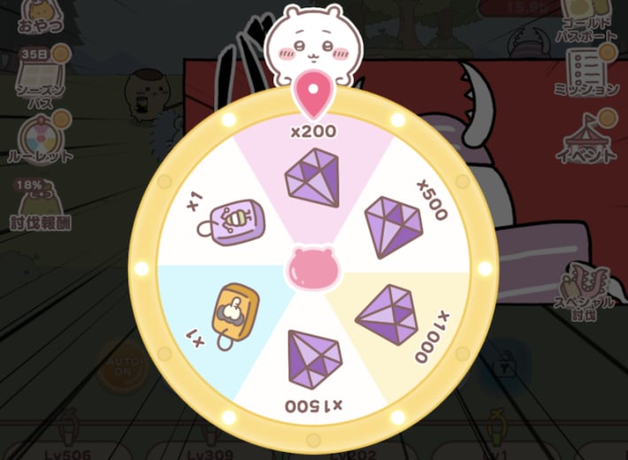 むちゃかんたん5-1で解放される「ルーレット」で、宝石を入手することができます。ルーレットは5分おきに1日5回まででき、2回目以降は広告視聴で回すことができます。