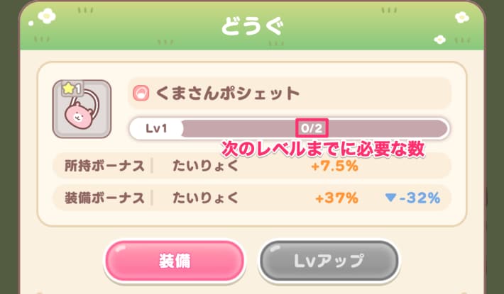 ちいぽけの道具は、同じ種類の道具を一定数集めることで強化することができます。強化することで、所持ボーナスや装備ボーナスの上昇値が上がります。