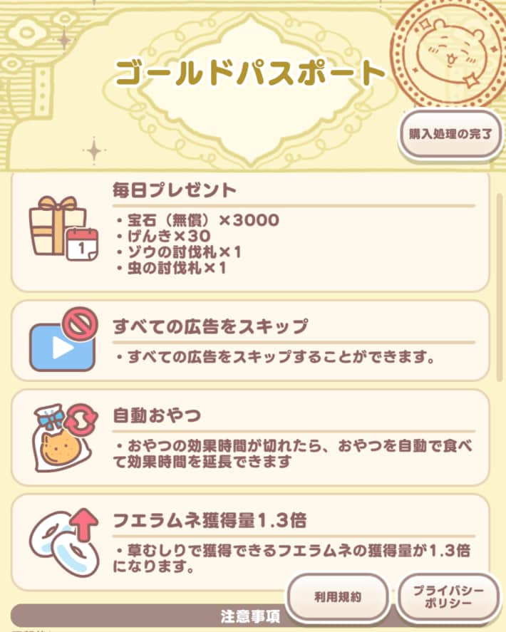 ちいぽけの課金要素で一番おすすめなのは、ゴールドパスポートです。ゴールドパスポートを購入すれば、広告再生が必要な要素を広告なしで受けられるだけでなく、討伐スピード常時2倍、自動おやつなどの効果が常に受けられます。ストレスフリーで効率的にプレイしたい人におすすめです。